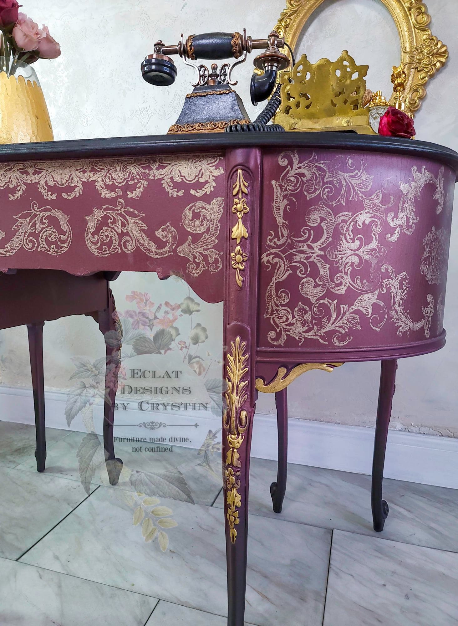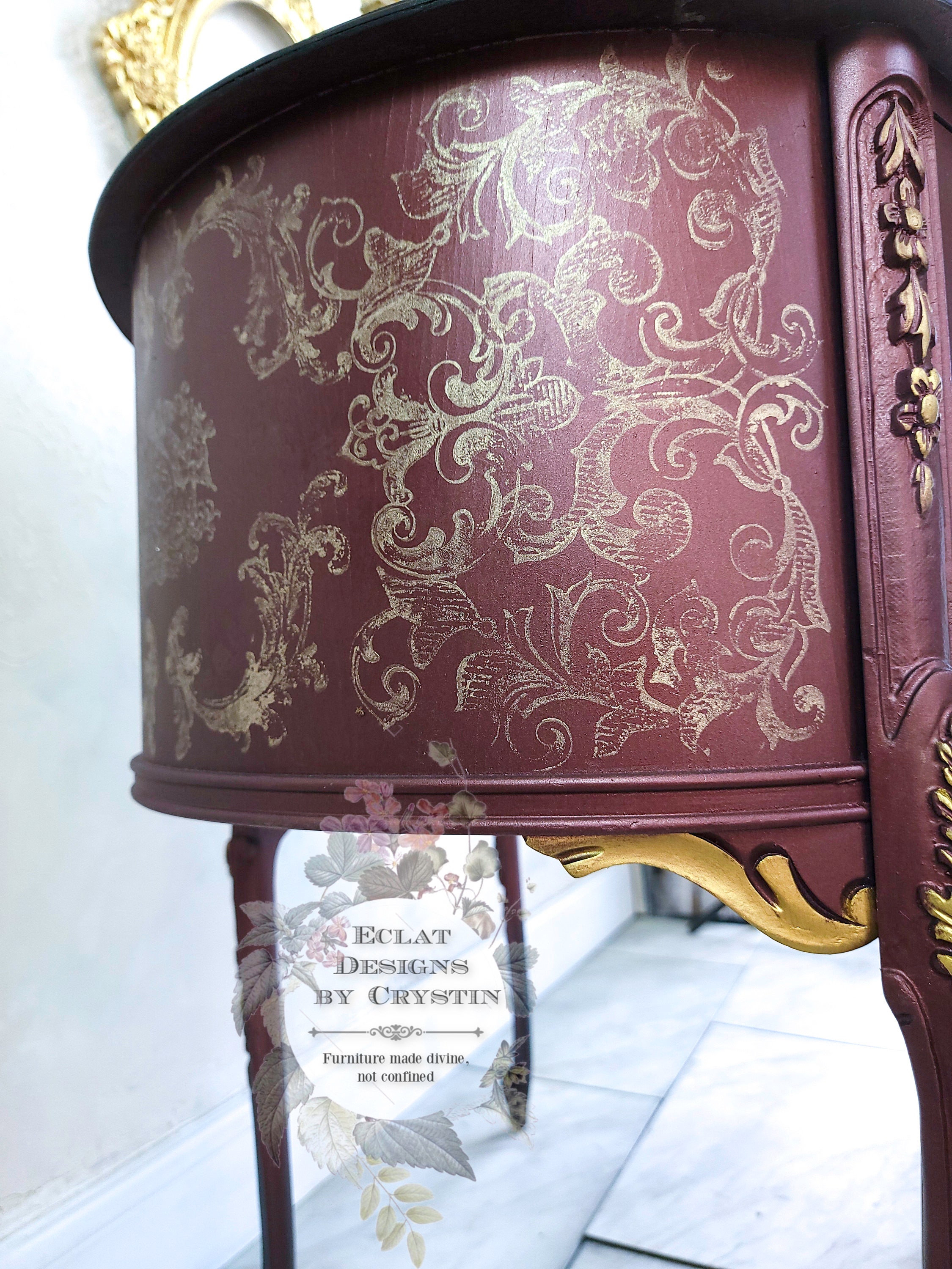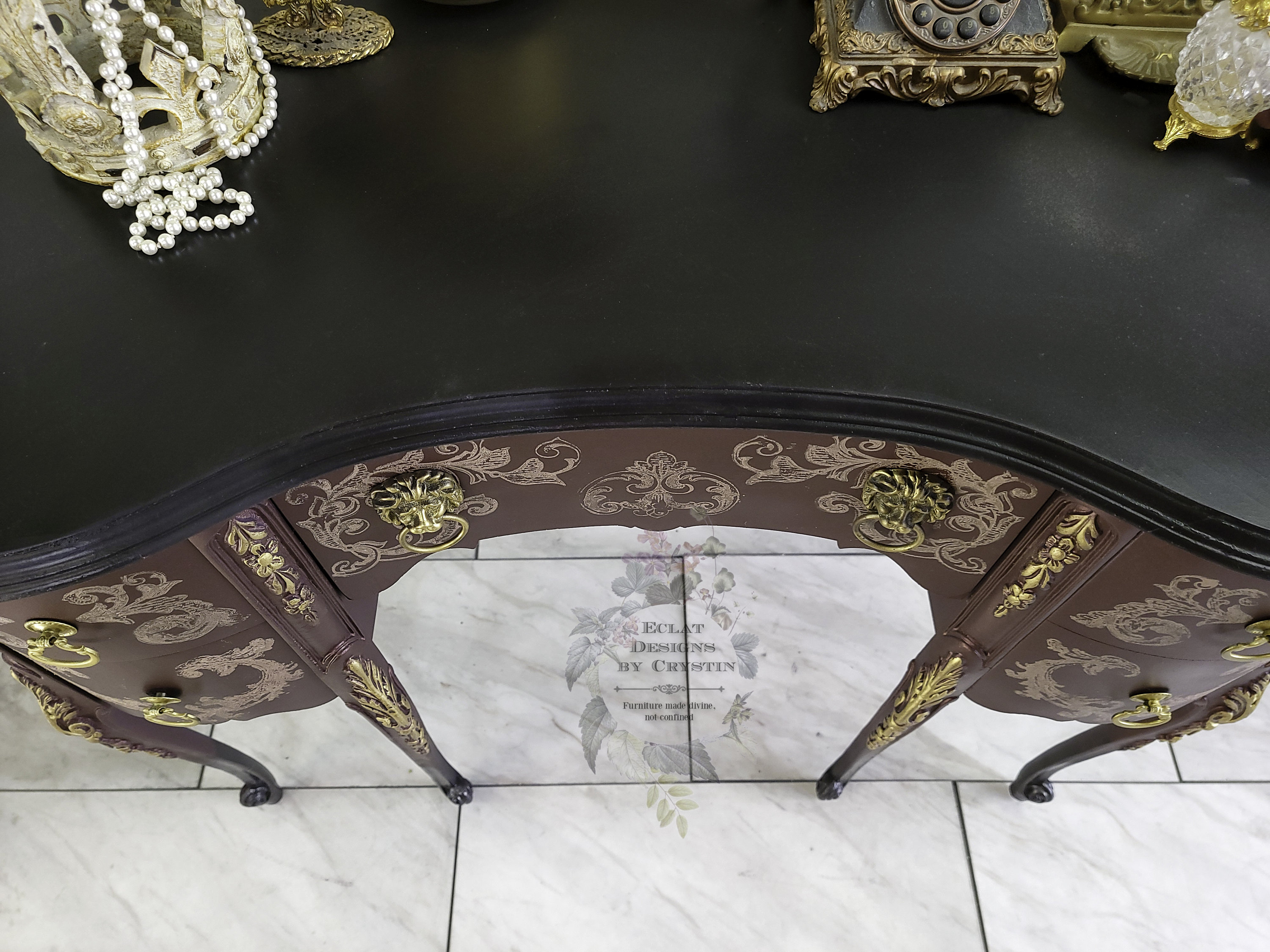 Sultry and seductive with her red dress and black heels, romance is aflame with this rococo desk. I love this design inspired by a piece of furniture I saw in a palace. The original had actual inlay scroll work but I used the Elegant Scrolls stamp to recreate it in my own way. I love my dramatic furniture pieces and this one definitely is swoon-worthy. She's meant to be the center of attention in a room with her 360 degrees detailing. It took me 3 years to find another one of these desks and well worth the wait. The finish reminds me of rich brocade which you can't resist touching. It has a satin finish with just enough shine for this femme fatale. There are 5 drawers with pulls. It has a kidney shape with curves for days. Delicate and ornate at the same time, it's a rare find.