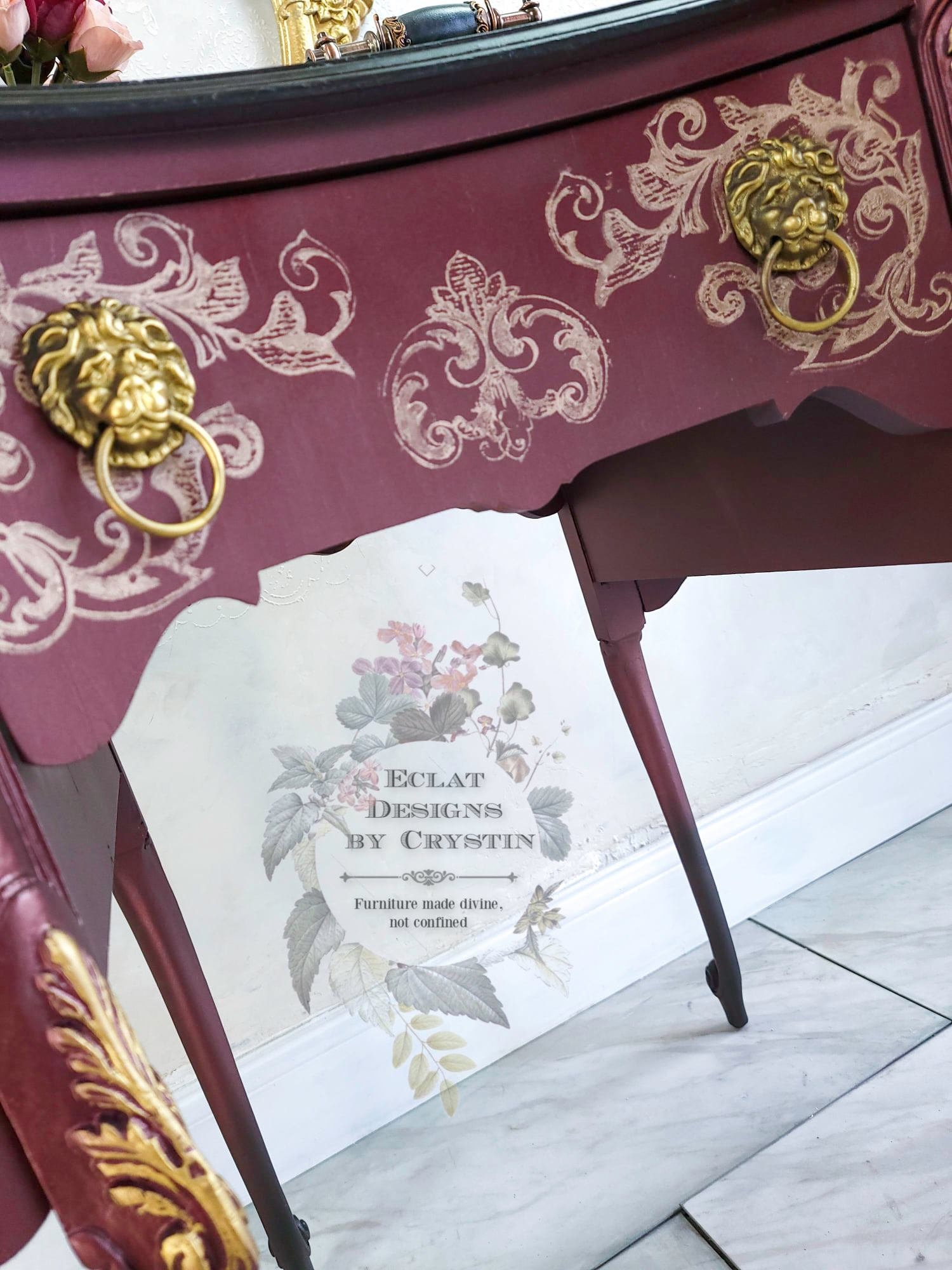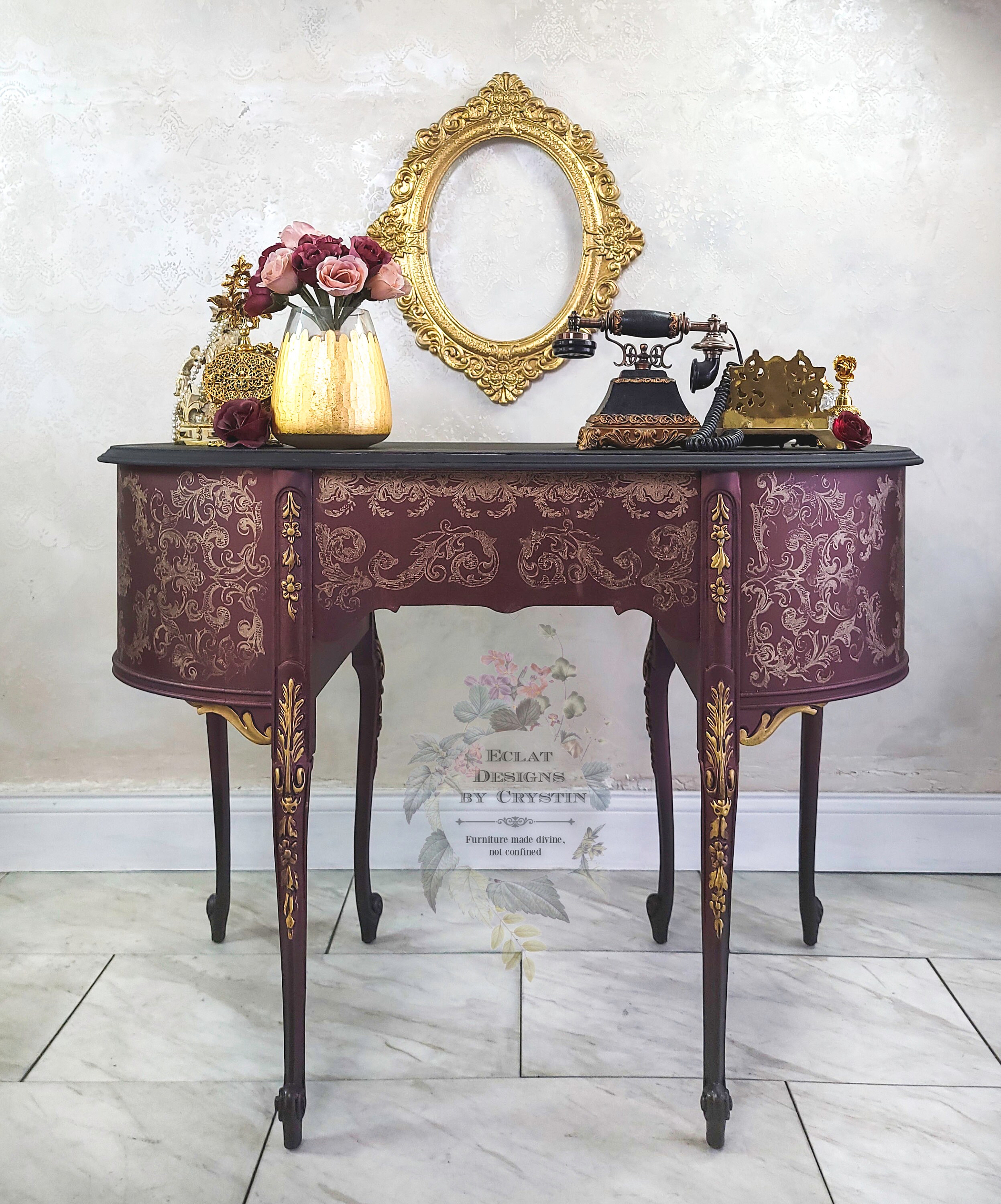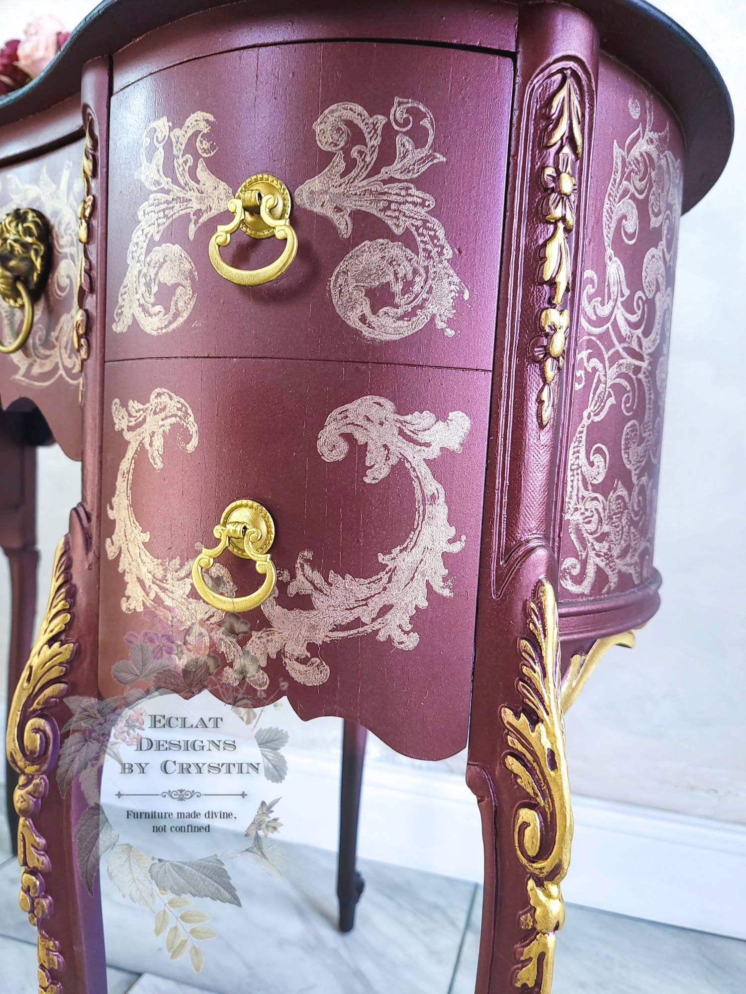Sultry and seductive with her red dress and black heels, romance is aflame with this rococo desk. I love this design inspired by a piece of furniture I saw in a palace. The original had actual inlay scroll work but I used the Elegant Scrolls stamp to recreate it in my own way. I love my dramatic furniture pieces and this one definitely is swoon-worthy. She's meant to be the center of attention in a room with her 360 degrees detailing. It took me 3 years to find another one of these desks and well worth the wait. The finish reminds me of rich brocade which you can't resist touching. It has a satin finish with just enough shine for this femme fatale. There are 5 drawers with pulls. It has a kidney shape with curves for days. Delicate and ornate at the same time, it's a rare find.