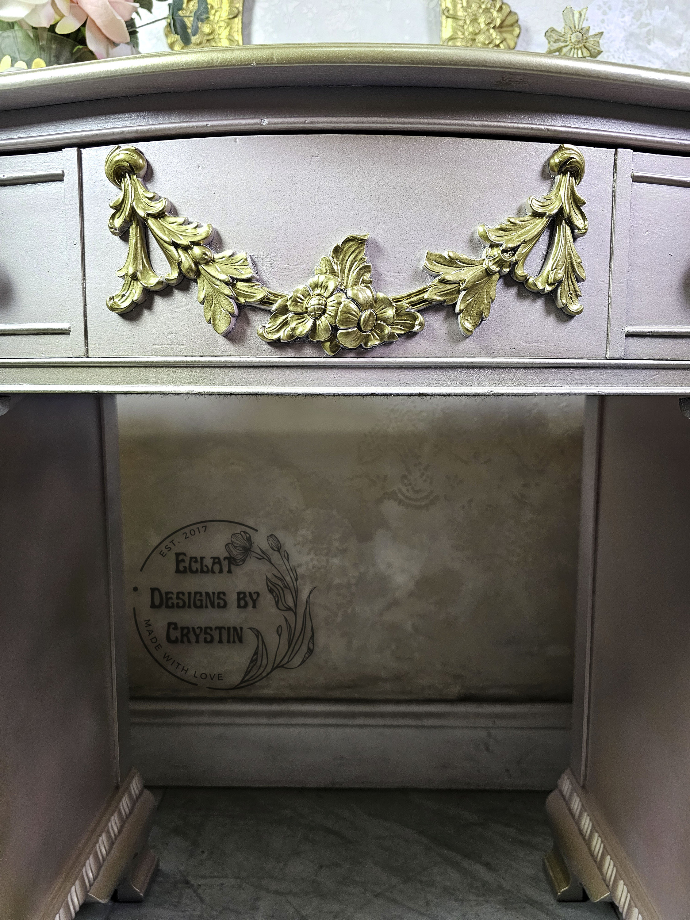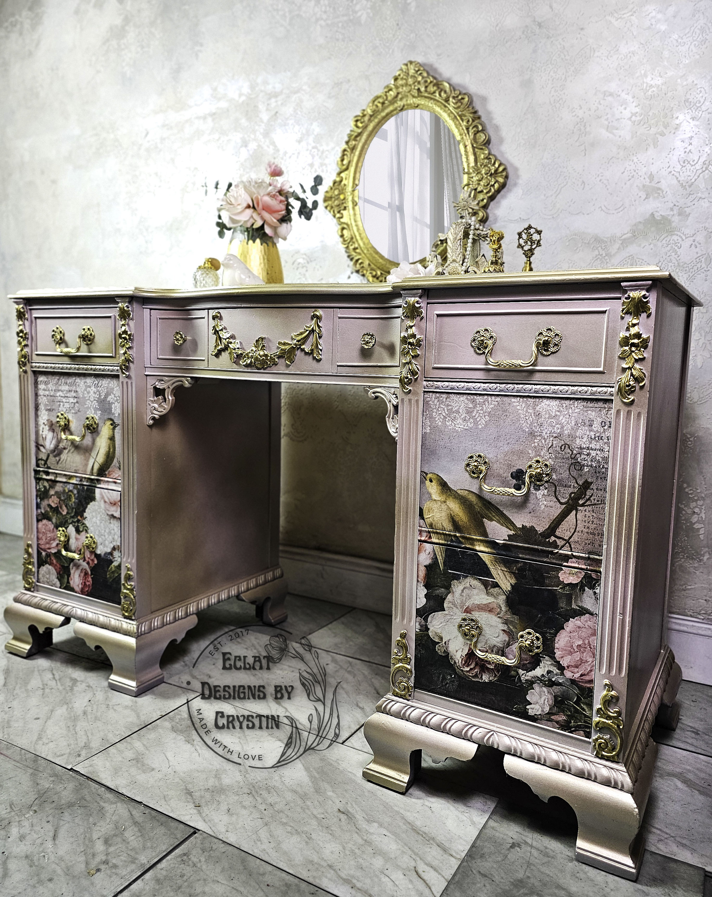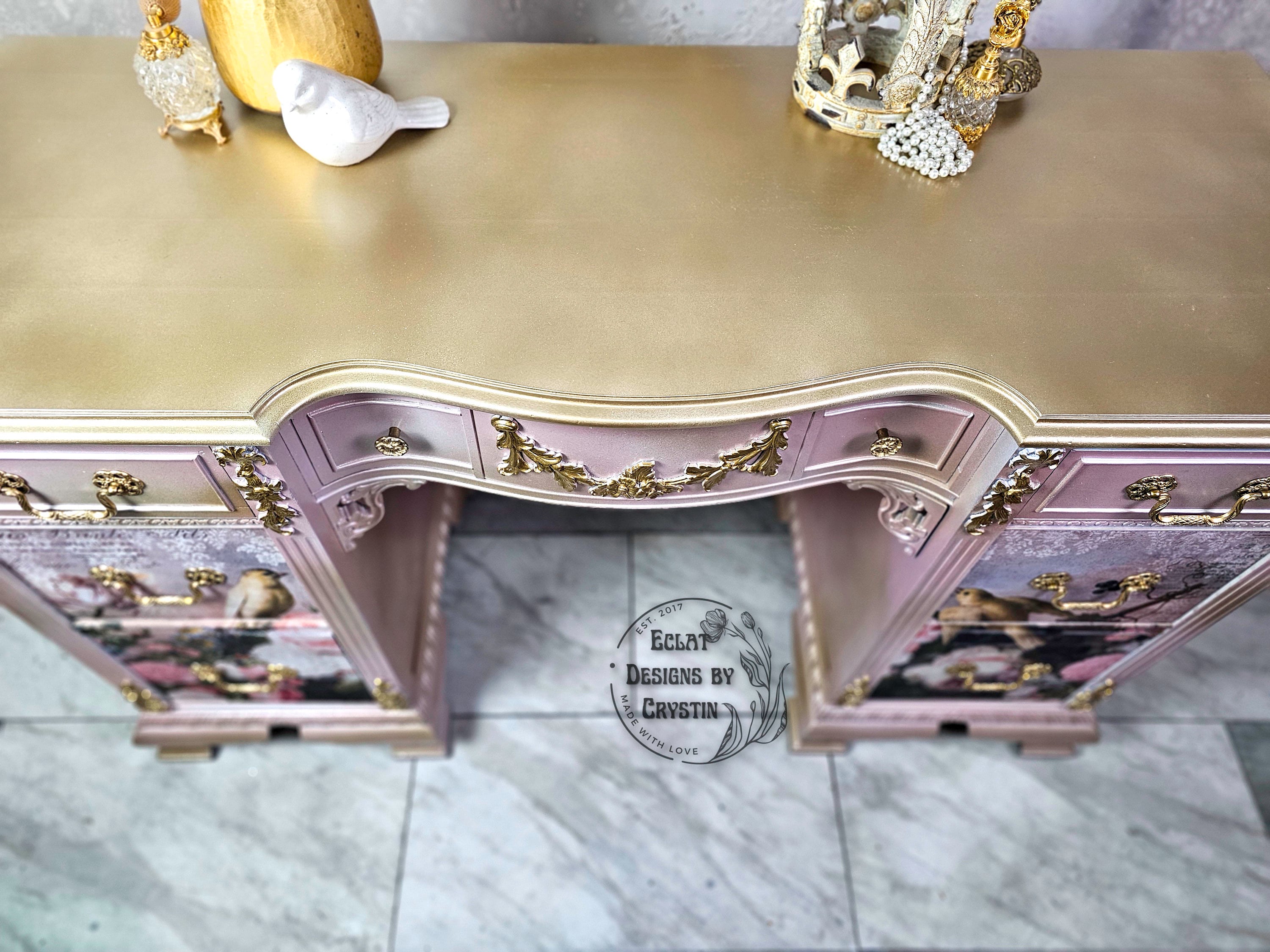 Romantic and ethereal, this office desk will sweep you away. The front drawers have a bird and blossoms design. There are 7 drawers total for your storage needs. It has a glowing pink and champagne color that has been handpainted. There are also ornate appliques that make it unique. The top is a metallic champagne color. It can also be a vanity if you add a hanging mirror on the wall. Gorgeous and uplifting you will be working in style.