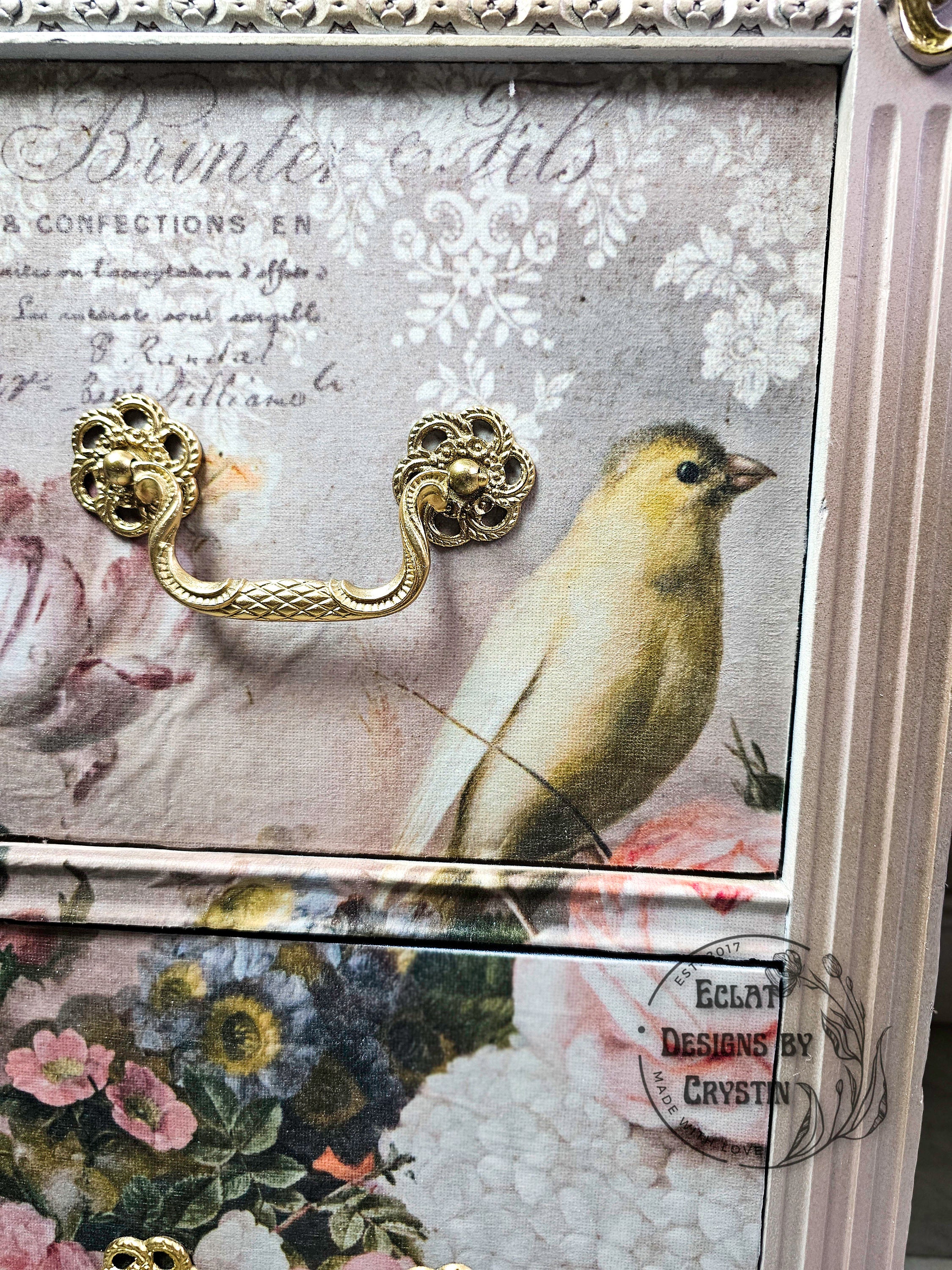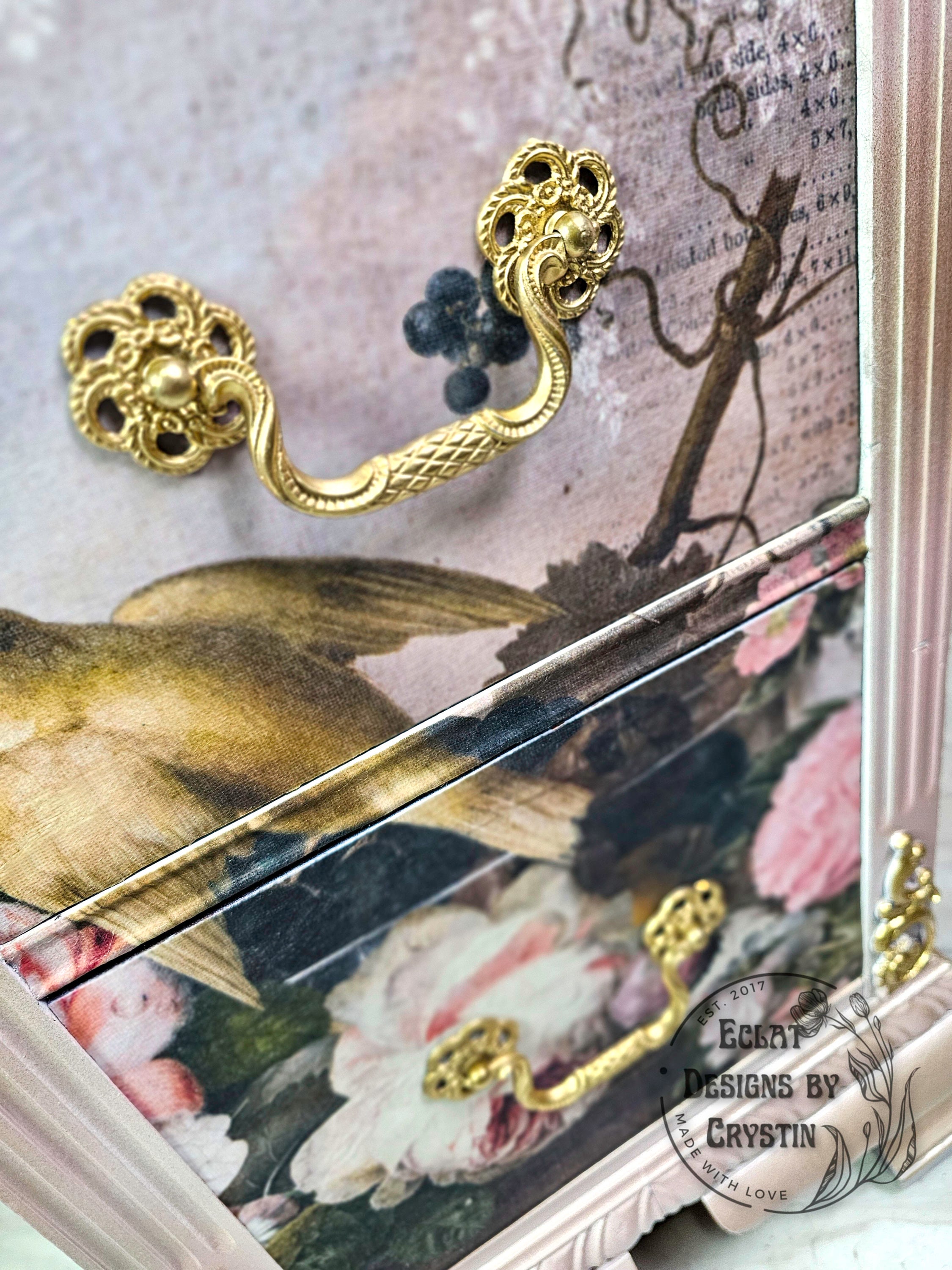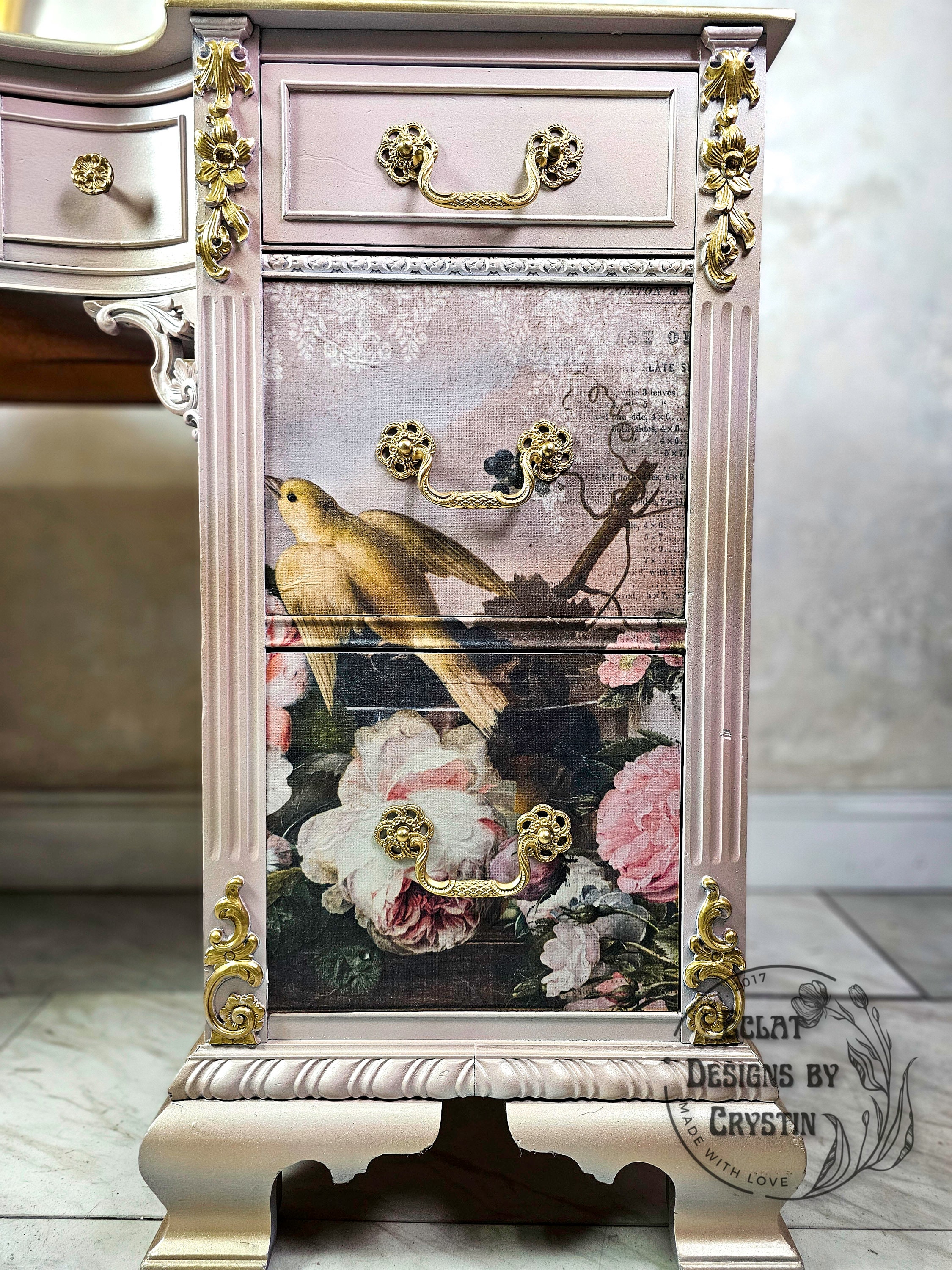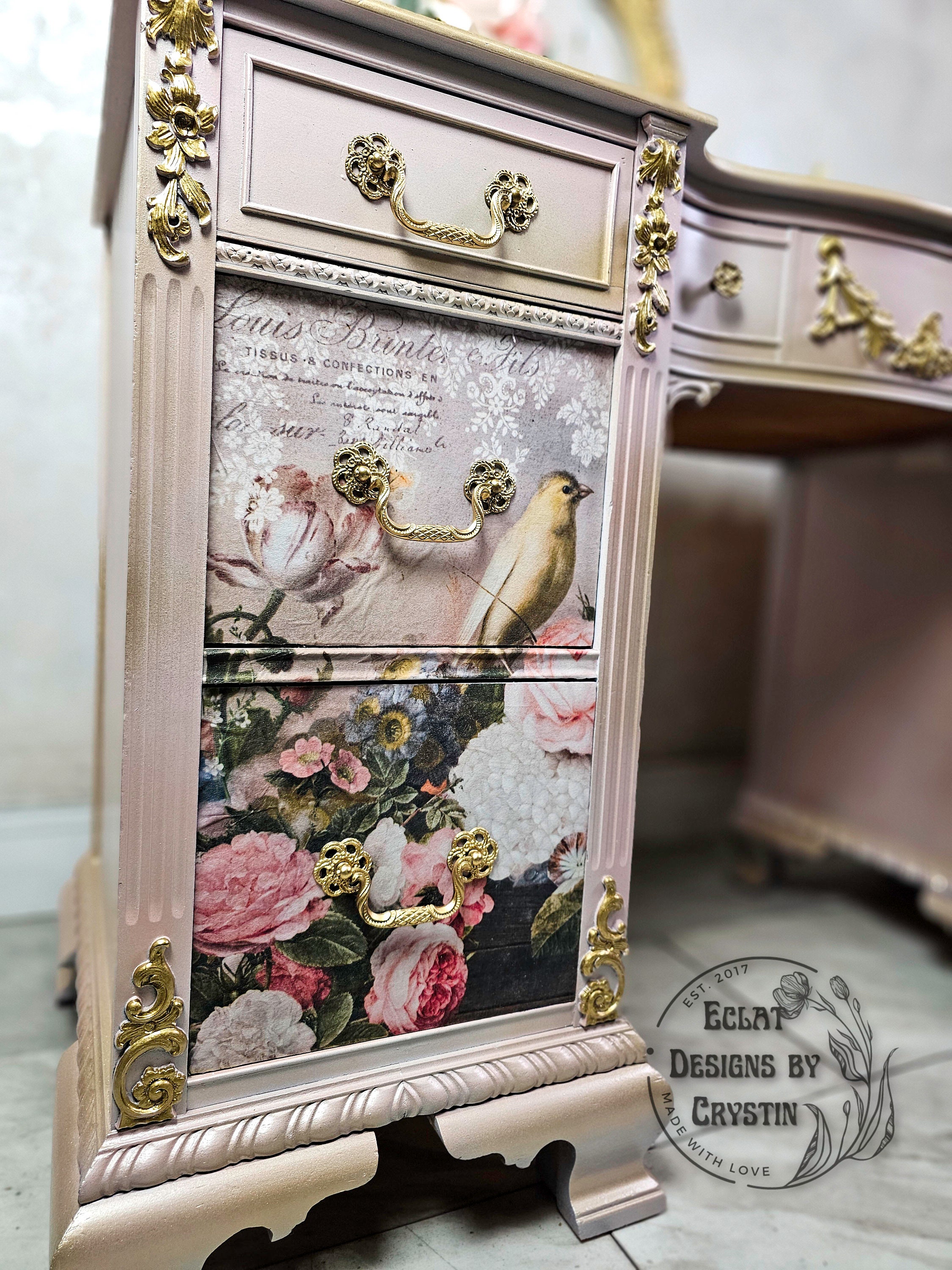 Romantic and ethereal, this office desk will sweep you away. The front drawers have a bird and blossoms design. There are 7 drawers total for your storage needs. It has a glowing pink and champagne color that has been handpainted. There are also ornate appliques that make it unique. The top is a metallic champagne color. It can also be a vanity if you add a hanging mirror on the wall. Gorgeous and uplifting you will be working in style.