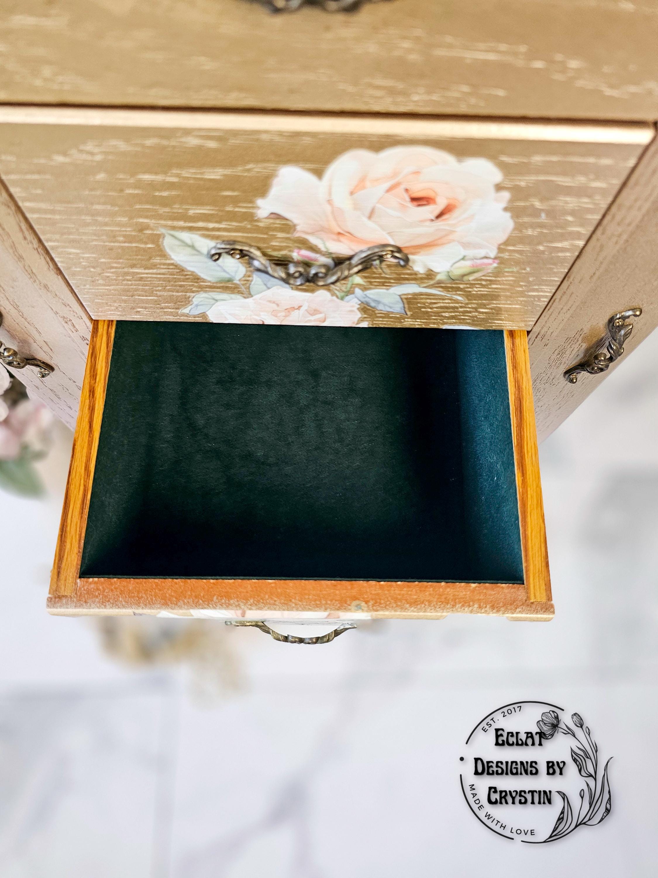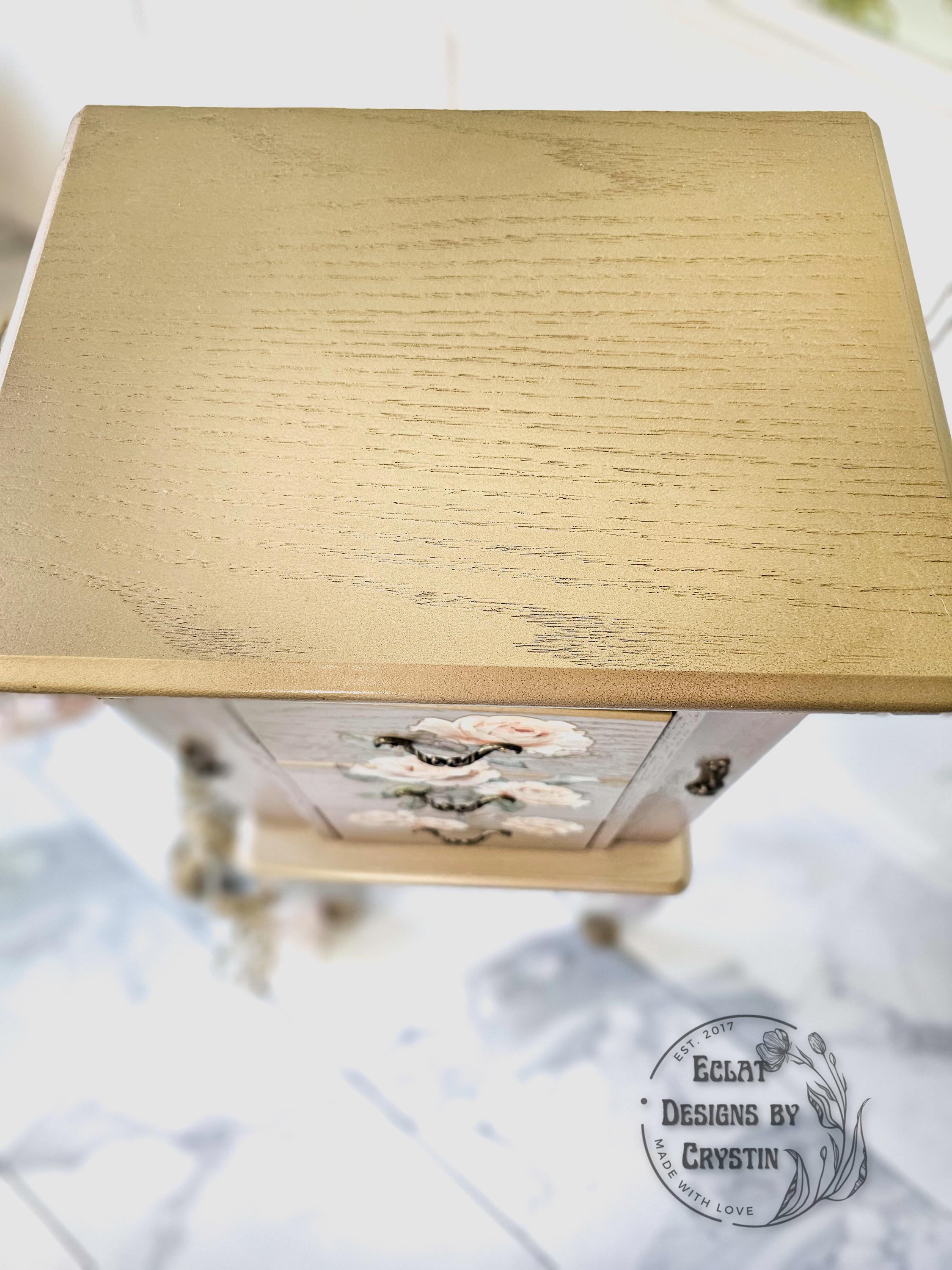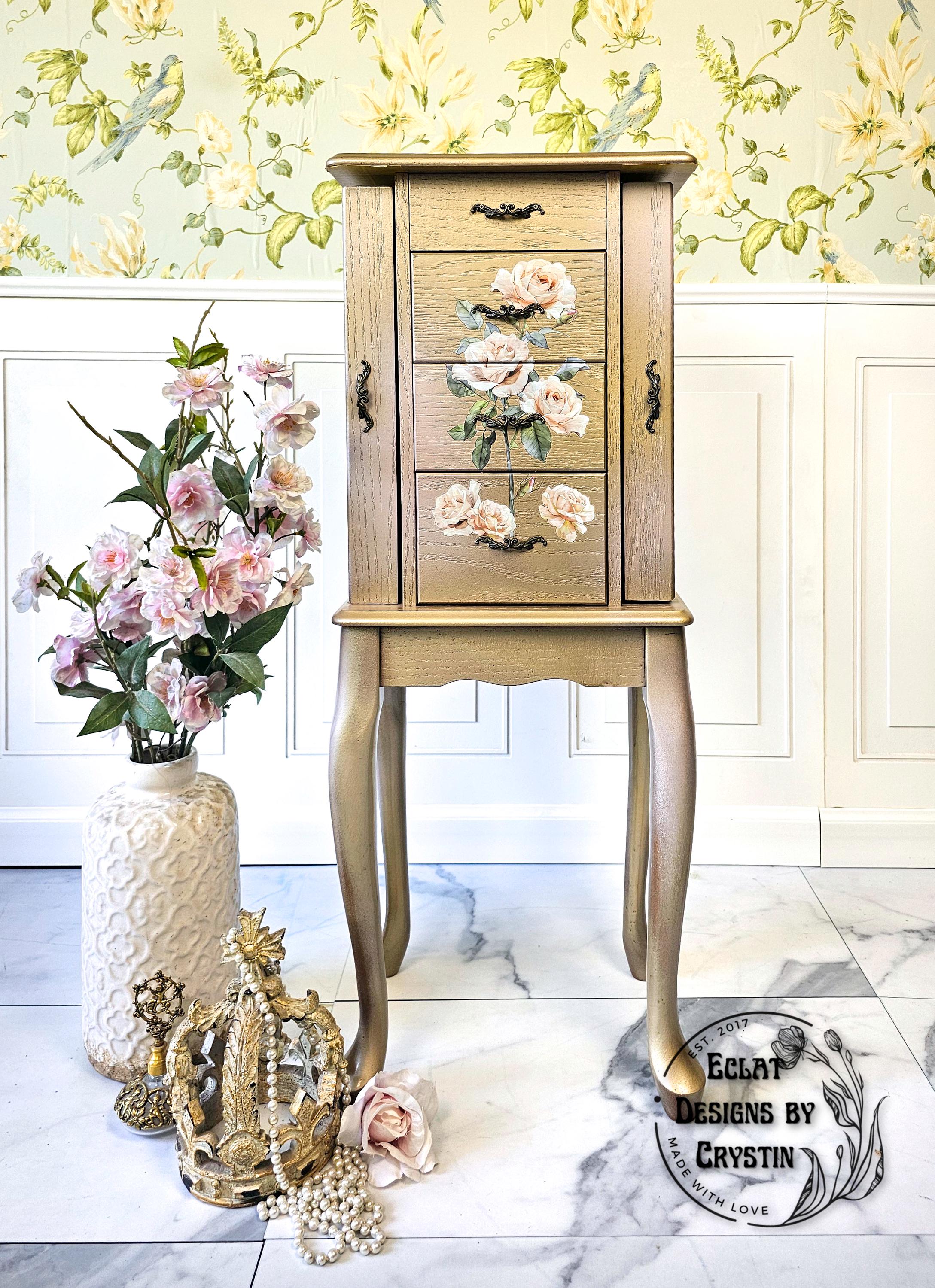 Immerse yourself in the luxury of our handmade Champagne Rose Jewelry Armoire! Covered in a stunning blend of champagne and blush rose paints, this handcrafted piece is not only beautiful but highly functional. The armoire features meticulously arranged compartments for safely tucking away your precious jewels including a ring holder, necklace hooks, and more. Its necklace hooks are designed to keep your chains untangled and easy to access. A small mirror can be found within, allowing you to try on and enjoy your jewelry selection without needing to move! The armoire is not only a utility piece, but a statement of elegance and delicacy, exhibiting the craftsmanship involved in its creation. This unique piece of decor is hand-painted, marking each armoire a beautifully unique creation. The subtle champagne paint is finely balanced with blush rose, enhancing your space with a touch of femininity and glamour.
