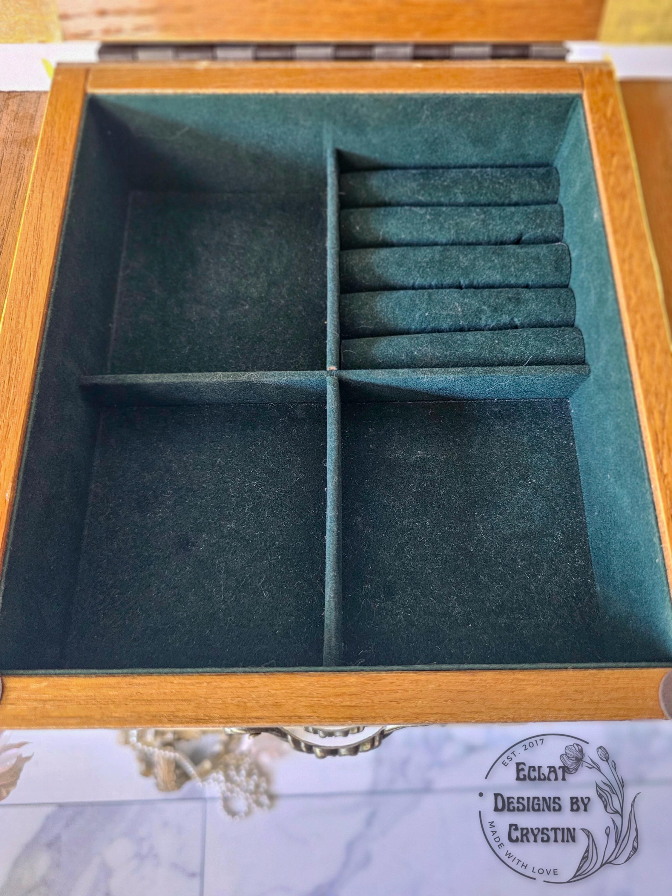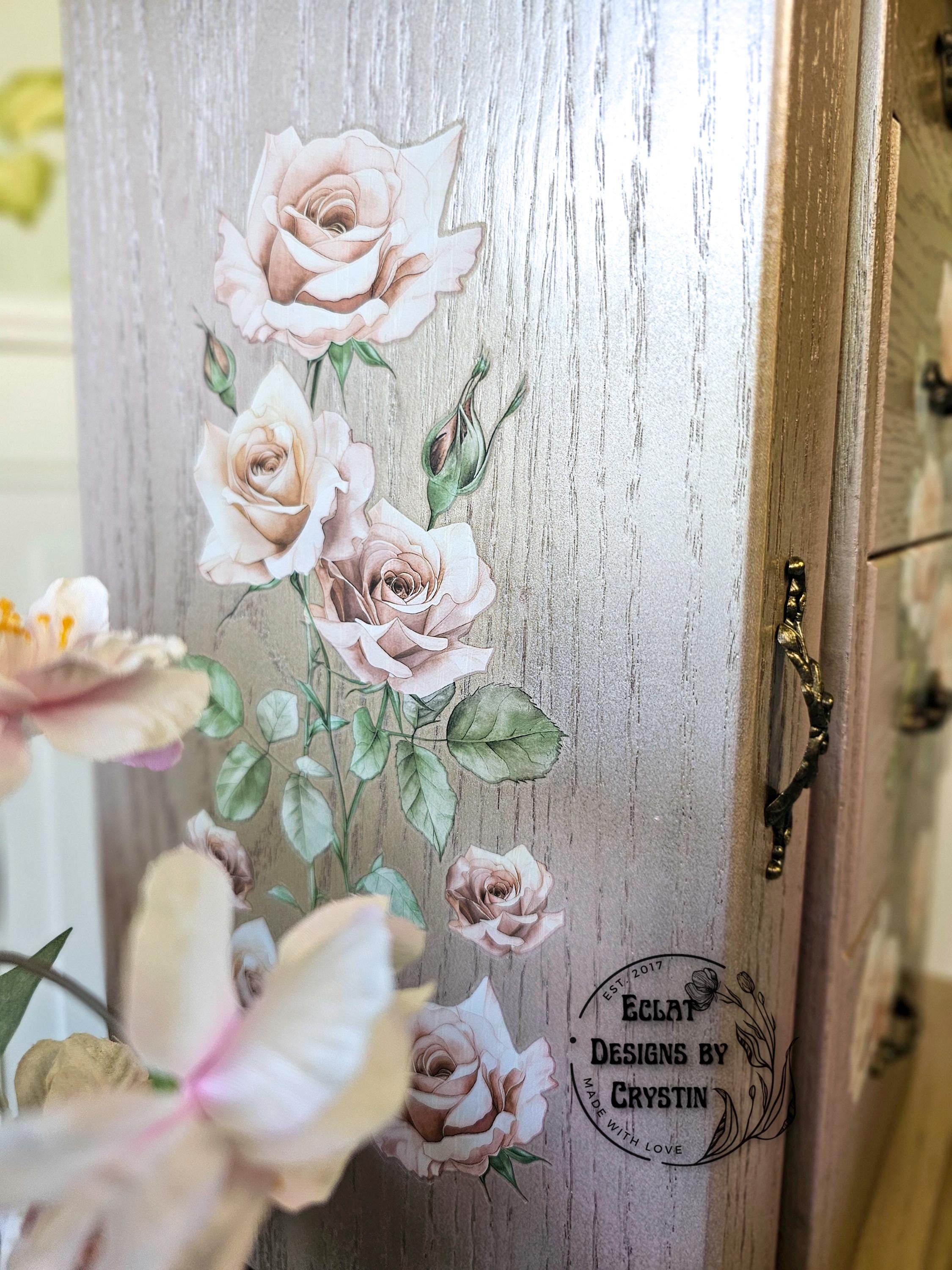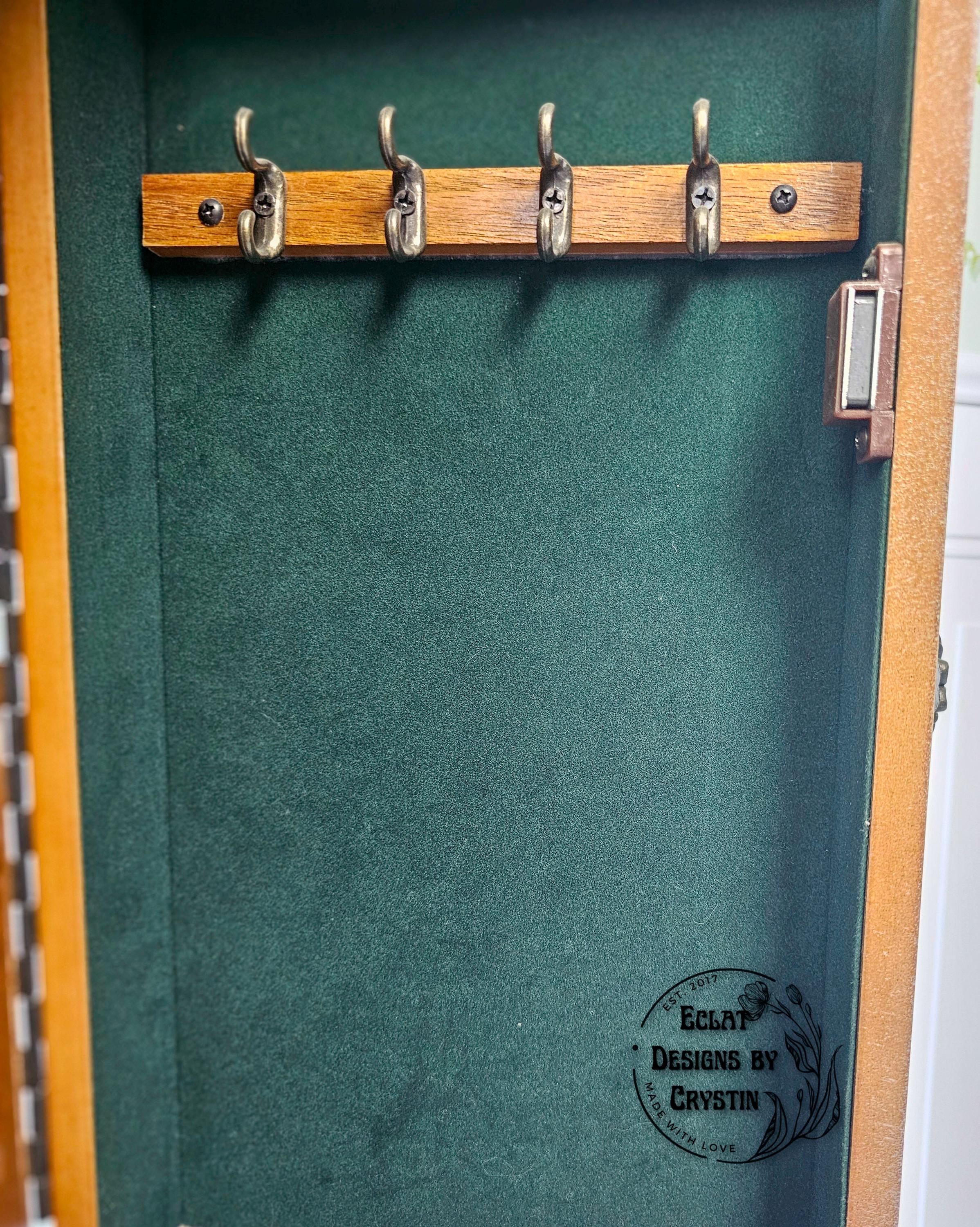 Immerse yourself in the luxury of our handmade Champagne Rose Jewelry Armoire! Covered in a stunning blend of champagne and blush rose paints, this handcrafted piece is not only beautiful but highly functional. The armoire features meticulously arranged compartments for safely tucking away your precious jewels including a ring holder, necklace hooks, and more. Its necklace hooks are designed to keep your chains untangled and easy to access. A small mirror can be found within, allowing you to try on and enjoy your jewelry selection without needing to move! The armoire is not only a utility piece, but a statement of elegance and delicacy, exhibiting the craftsmanship involved in its creation. This unique piece of decor is hand-painted, marking each armoire a beautifully unique creation. The subtle champagne paint is finely balanced with blush rose, enhancing your space with a touch of femininity and glamour.