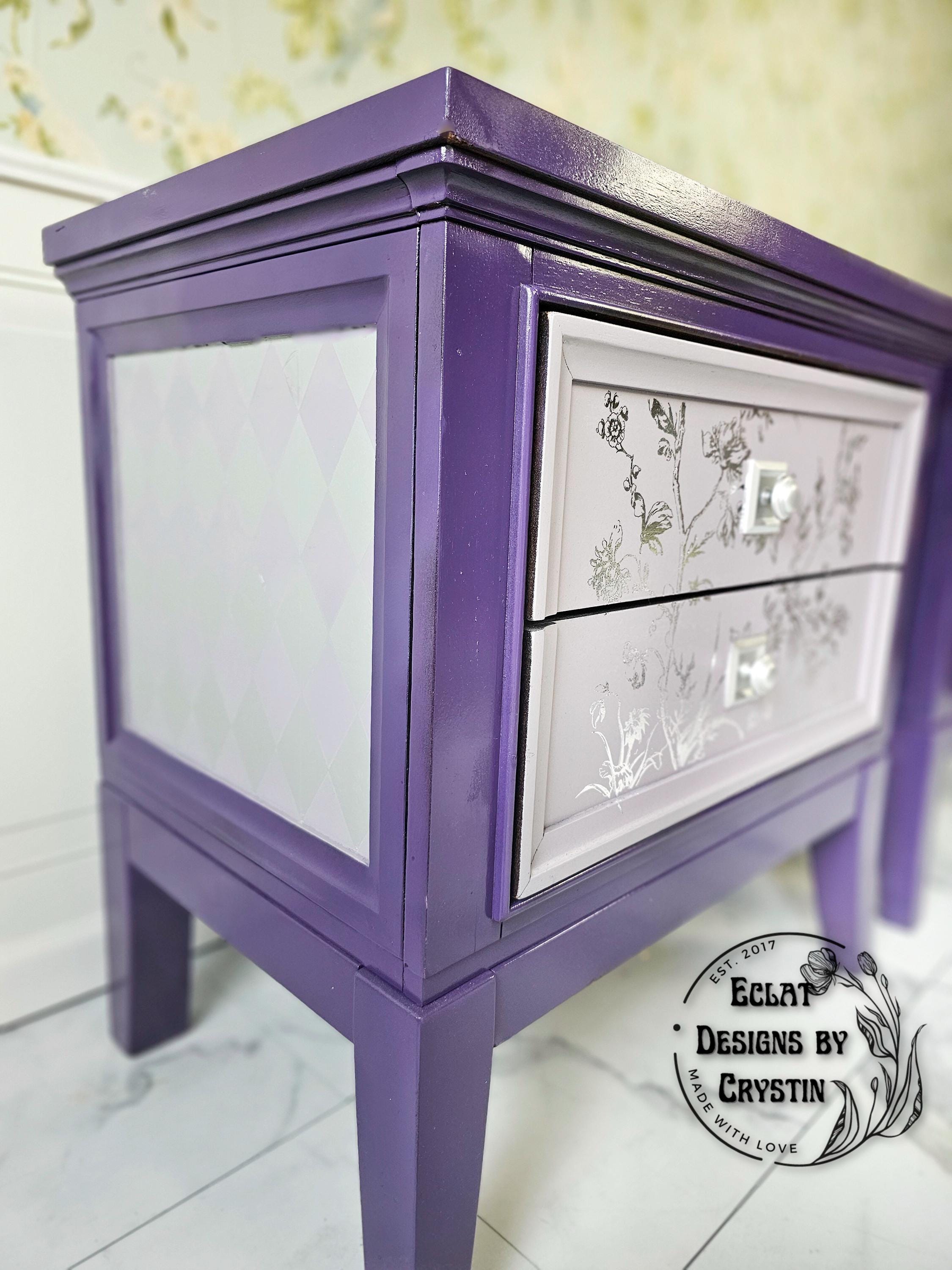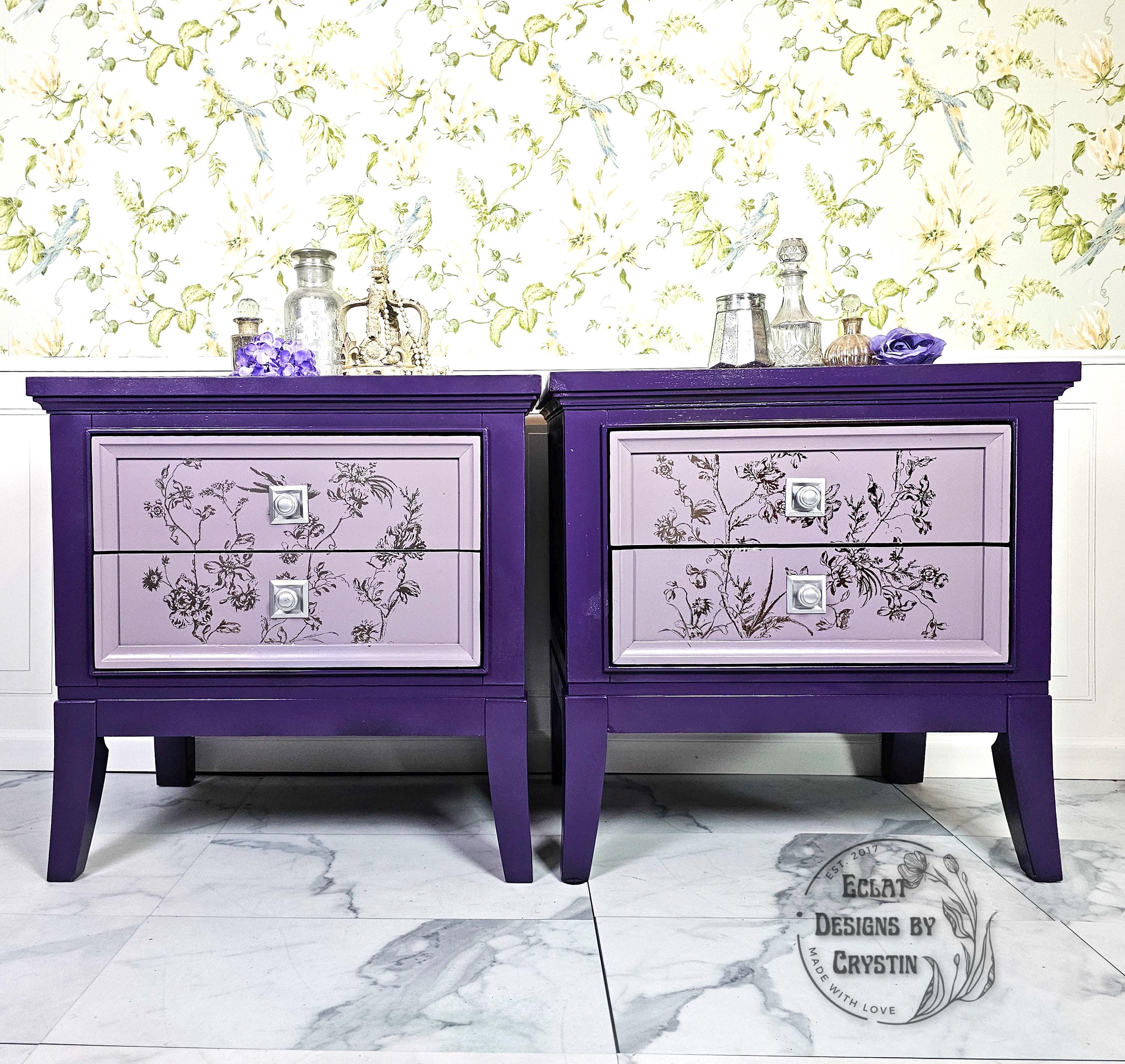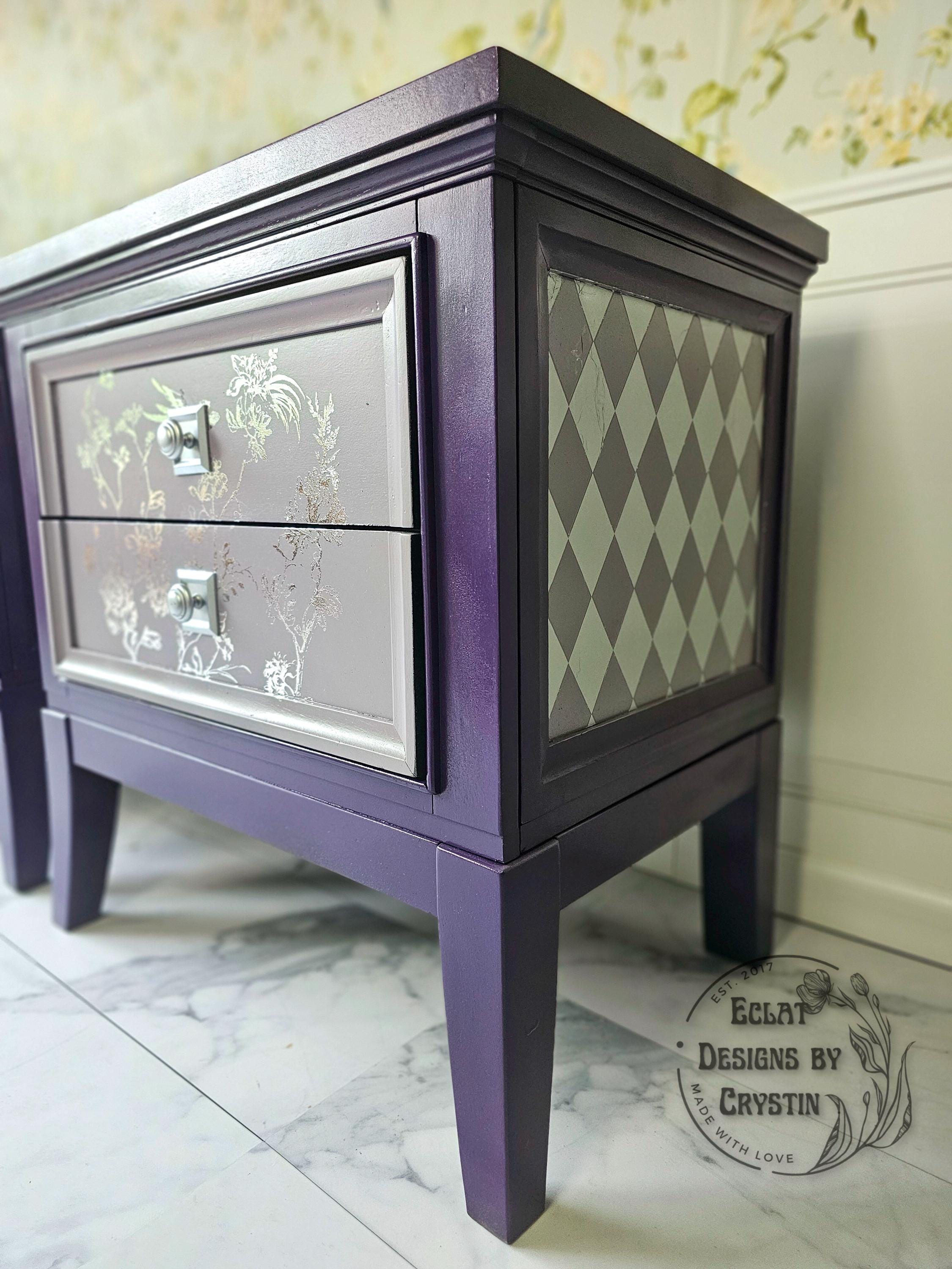 Silver Birds and Blossoms Handmade Purple Nightstands with Silver Harlequin Sides and 2 Drawers